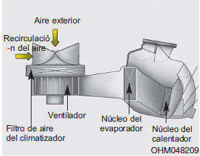El filtro de aire del climatizador, que se encuentra detrás de la guantera, filtra el polvo y otros contaminantes que puedan entrar en el vehículo desde el exterior a través del sistema de calefacción y aire acondicionado. Si se acumula polvo u otros contaminantes en el filtro, puede disminuir la cantidad de aire que sale por los orificios de ventilación, ocasionando una acumulación de humedad en el interior del parabrisas aunque se haya seleccionado la posición de aire exterior (nuevo). Si ocurriera esto, haga que un concesionario autorizado de Kia sustituya el filtro de aire del acondicionador.